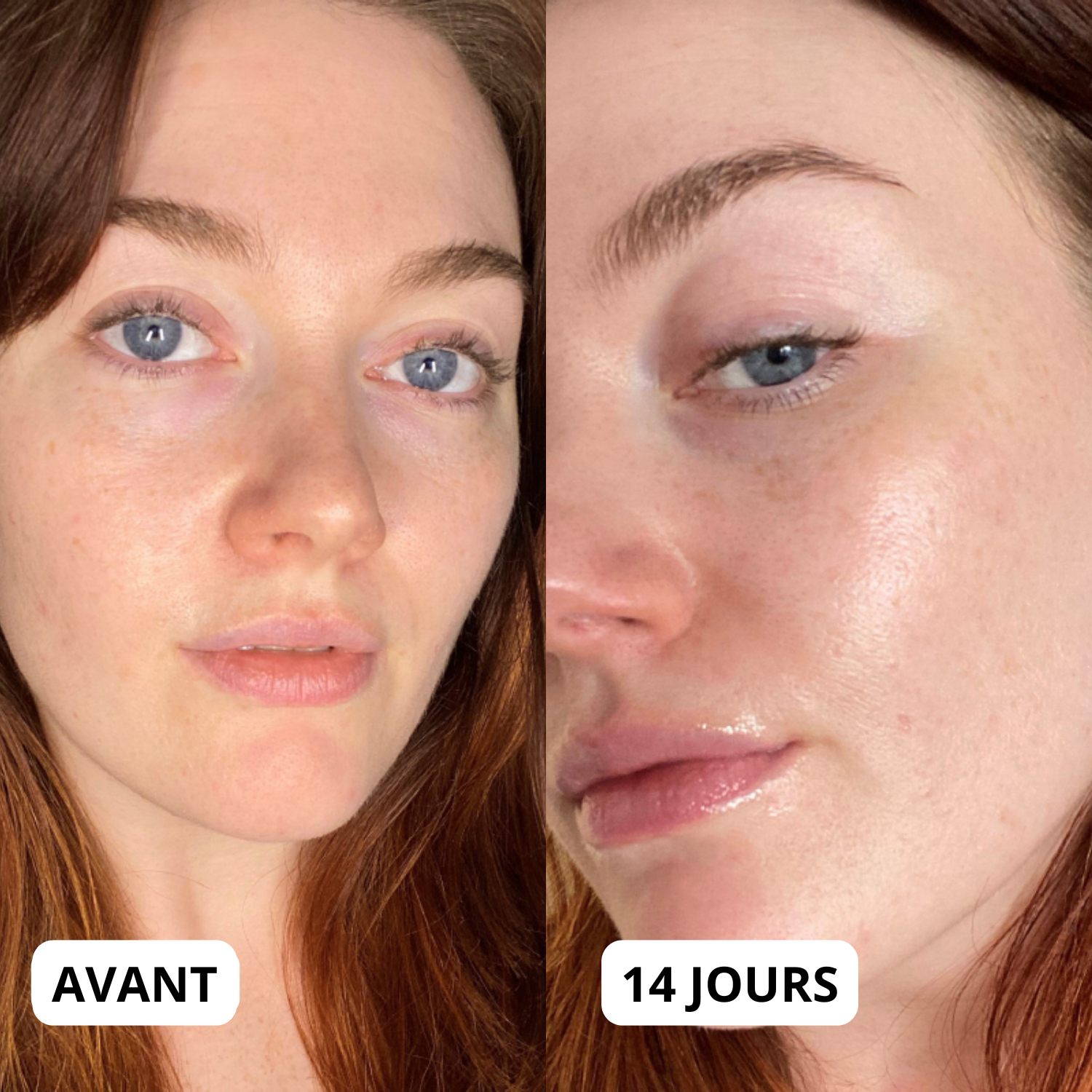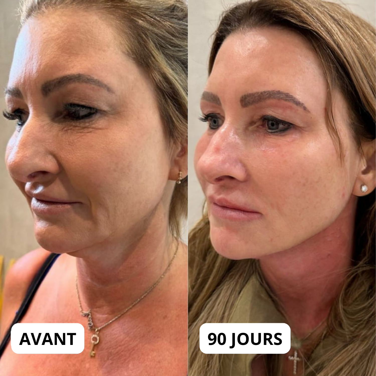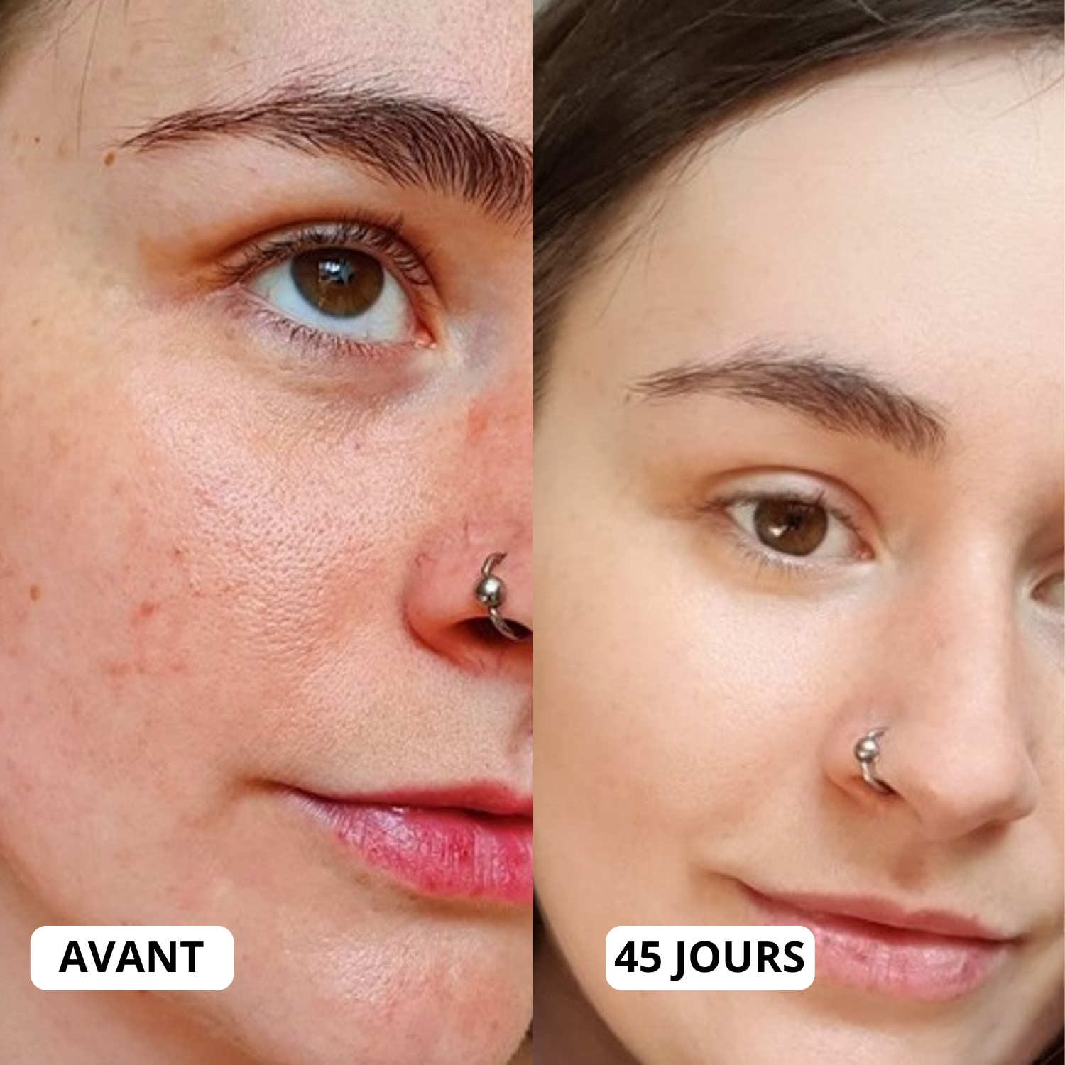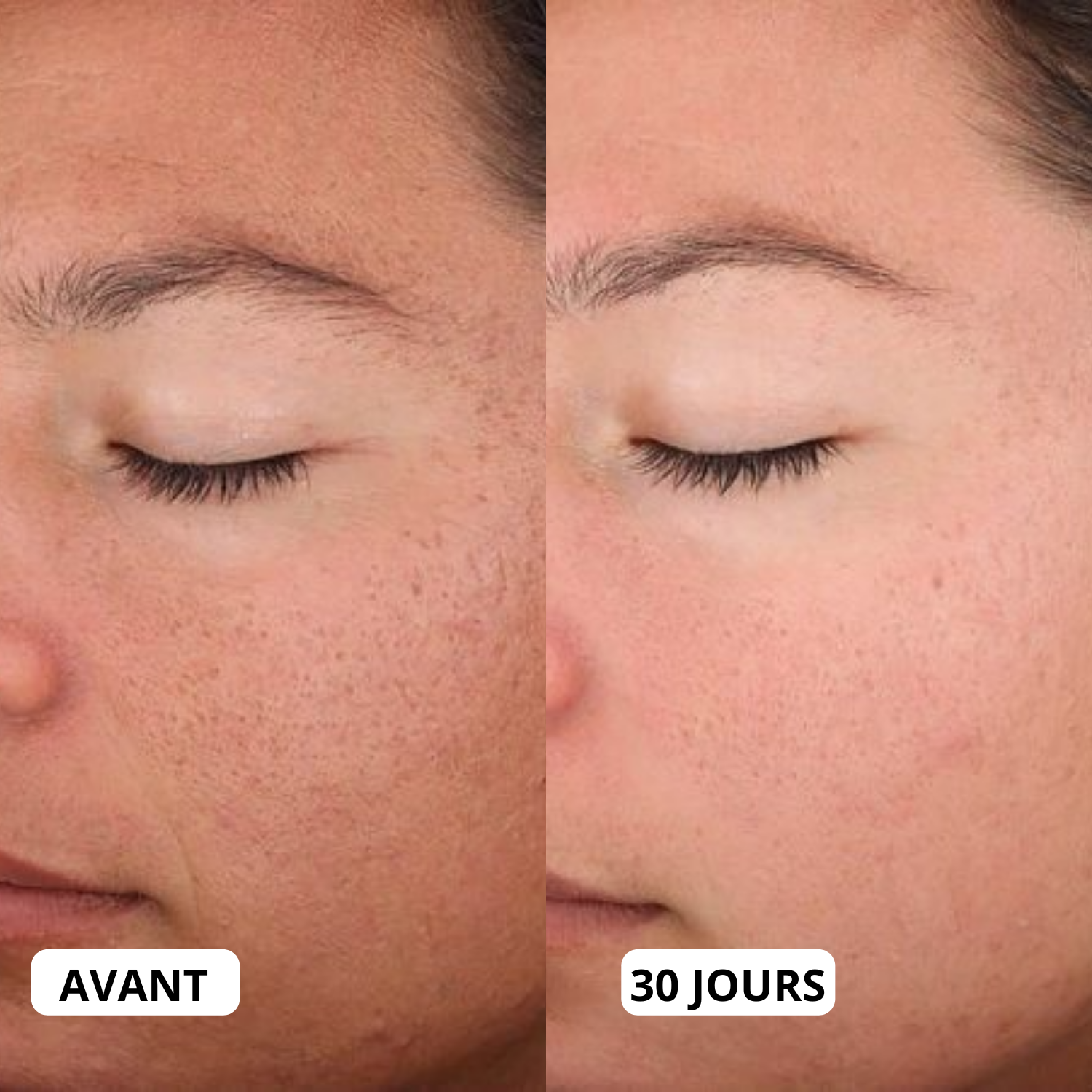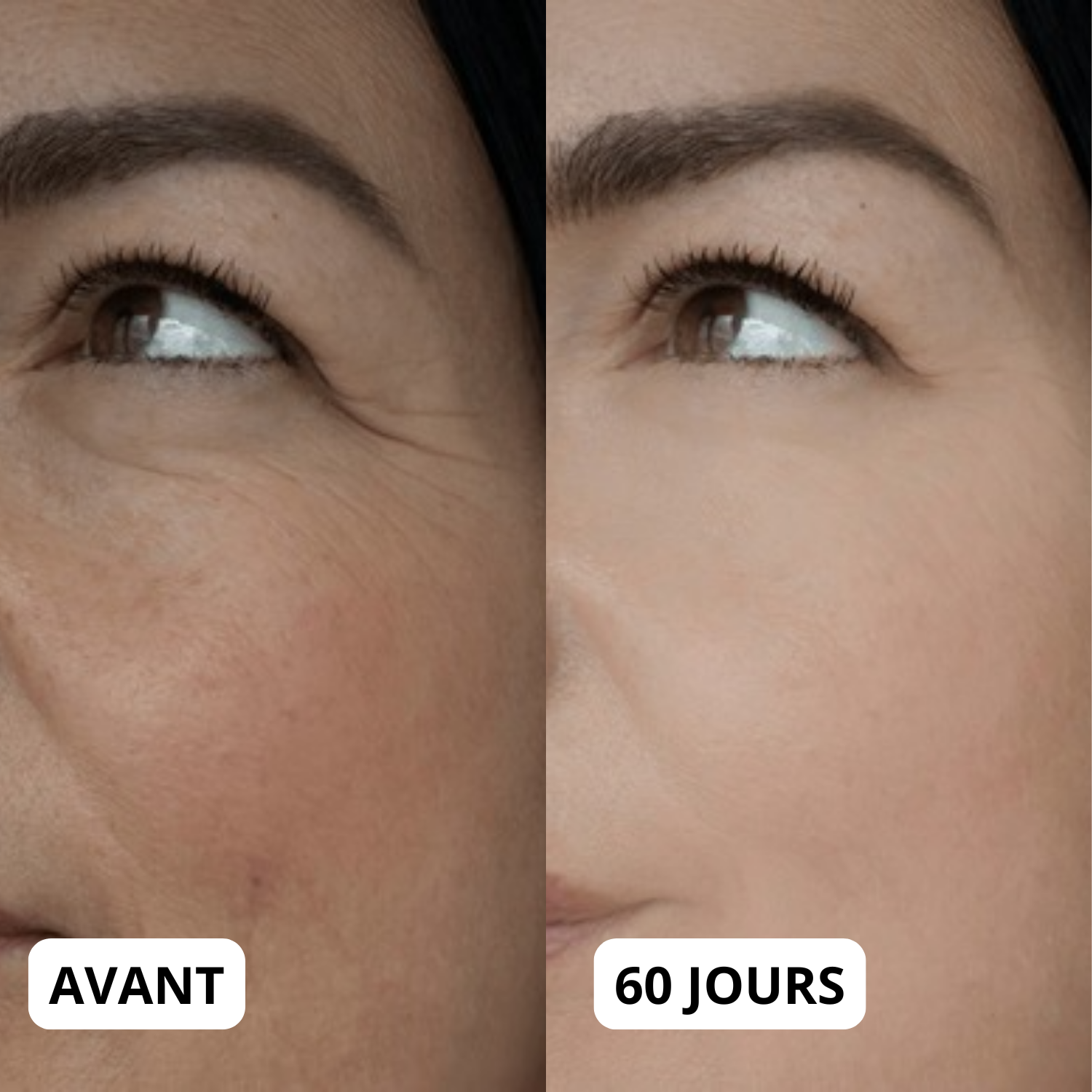 Observez les résultats en moins de 30 jours : une peau plus nette, moins de relâchement, des ridules et rides atténuées, et un teint visiblement plus jeune et éclatant.