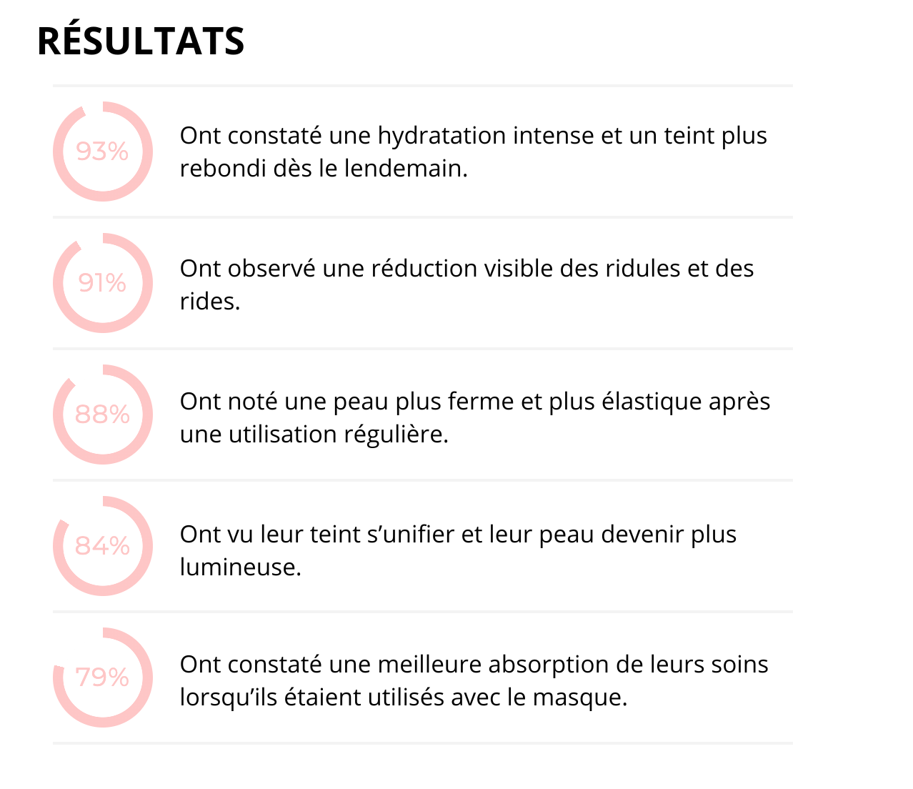 Les résultats varient selon le type de peau et les préoccupations individuelles. La plupart des utilisateurs constatent une amélioration de l’hydratation, de la fermeté et du teint après seulement quelques utilisations.